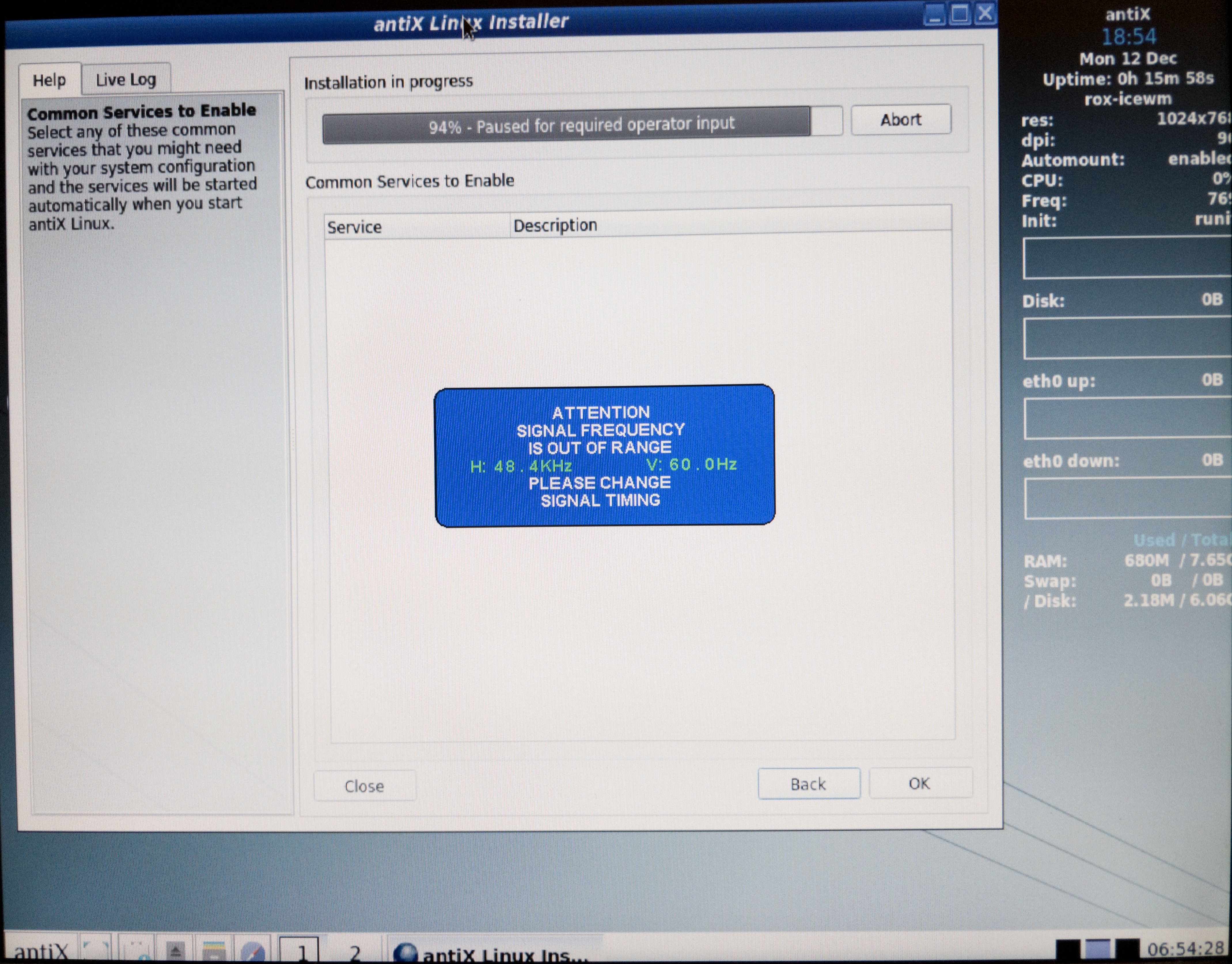 ::OK, staring afresh, but stuck at the installation screen with Service Settings (advanced). During the previous installations, I have been able there to select severeal services, such as anacron and dbus, but now the list Common Serivices to Enable is empty (photo). How can I cause the installer to populate it and let me select the ones I need? I am running the installer from a USB stick written in dd mode from antiX-22-runit_x64-base.iso.